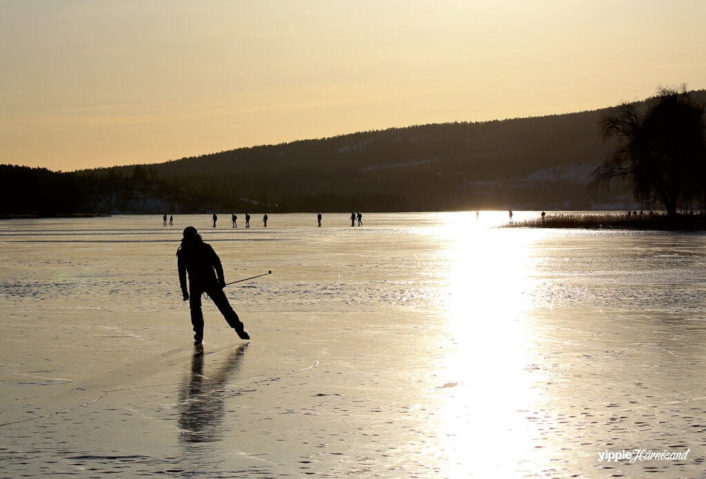 9 /2 2023 kl 15.35 Södra sundet/Kanaludden. Björn Larsson tar på sig skridskorna och åker mot den magiska solen. Rekordfebruari har bjudit på fina skridskoisar. Vi tackar för det. Samma dag hade Friluftsfrämjandet prova-på dag och ett 50-tal själar hade hörsammat inbjudan.