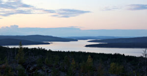 Vi stannar till med bilen strax innan Örsjön och fångar de andra på bild en gång till samtidigt som solen börjar leta sig över bergskammen i öster. Det är vackert på Härnön!