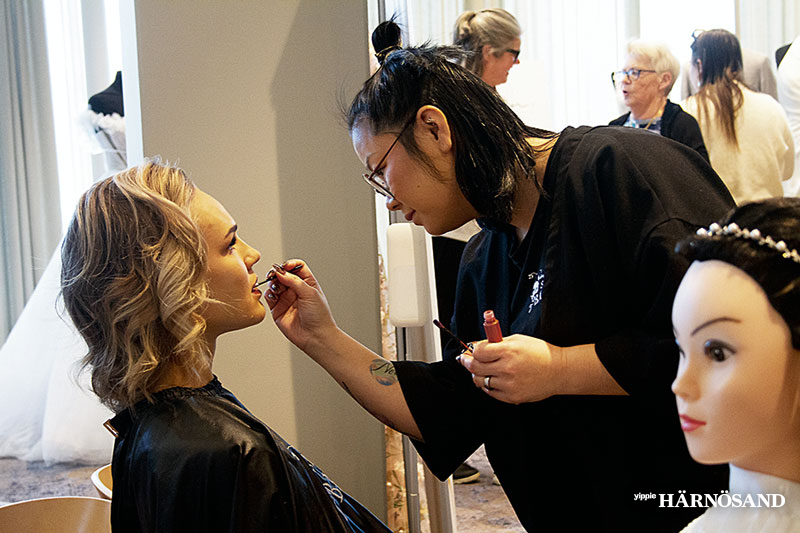 Cassandra Pettersson, en av modellerna, sminkas av Dorion Karlsson.